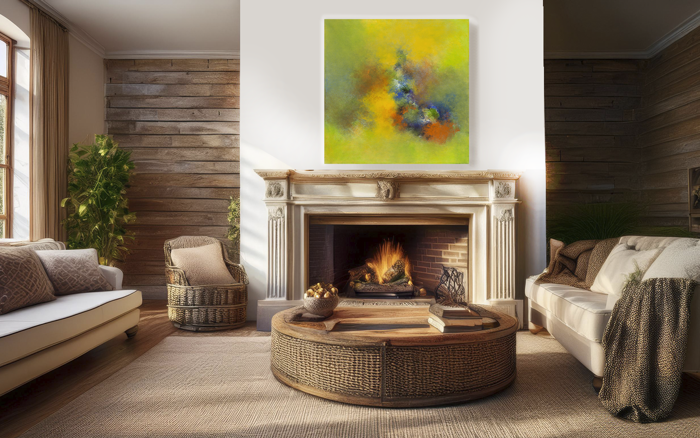 Imagina una sala con muebles rústicos de madera maciza, alfombras tejidas a mano y una chimenea de ladrillos desgastados. Sobre esa misma pared, una obra abstracta en tonos vibrantes y formas dinámicas de Garcia-Franco introduce un giro inesperado.